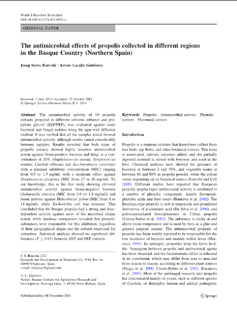 World Journal of Microbiology and Biotechnology , en línea Primero La actividad antimicrobiana de extractos de propóleos 19 preparado en diferentes disolventes (etanol y el glicol de propileno) (EEP / PPE), fue evaluados en relación con algunas cepas de bacterias y hongos usando el método de difusión en agar-bien. Se verificó que todas las muestras analizadas mostraron actividad antimicrobiana, aunque los resultados varían considerablemente entre las muestras. Los resultados revelaron que ambos tipos de extractos de propóleos mostraron actividad antimicrobiana altamente sensible contra bacterias Gram-positivas y hongos en una concentración de 20% (Staphylococcus aureus, Streptococcus mutans, Candida albicans y Saccharomyces cerevisiae) con una concentración mínima inhibitoria (CMI) que van desde 0,5 a 1,5 mg / ml, con un efecto moderado contra el Streptococcus pyogenes (MIC 17 a 26 mg / ml). A nuestro entender, este es el primer estudio que muestra la actividad antimicrobiana elevada contra bacterias Gram-negativas [Salmonella enterica (MIC de 0,6 a 1,4 mg / ml)] y menor actividad contra Helicobacter pylori (MIC 6 a 14 mg / ml), mientras que Escherichia coli era resistente. Esta conclusión de que el propóleos Vasco tenía una fuerte actividad y dependiente de la dosis frente a la mayoría de las cepas microbianas ensayadas , mientras que la comparación de bases de datos reveló que las sustancias fenólicas fueron los responsables de esta inhibición, independientemente de su origen geográfico y el disolvente empleado para la extracción. El análisis estadístico no mostró diferencias significativas entre la AEA y los extractos de PEP.